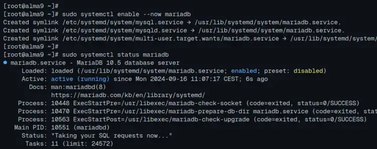 sudo systemctl enable --now mariadb sudo systemctl status mariadb