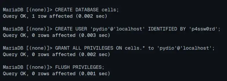 CREATE DATABASE cells; CREATE USER 'pydio'@'localhost' IDENTIFIED BY 'p4ssw0rd'; GRANT ALL PRIVILEGES ON cells.* to 'pydio'@'localhost'; FLUSH PRIVILEGES;
