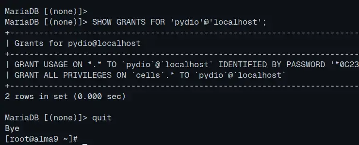 Now check the privileges for user ‘pydio‘ to ensure permission and privileges to the database ‘cells‘.