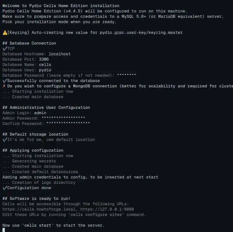 Now you’ll start installing Pydio Cells from the command line. With the ‘cells‘ command, you’ll be setting Pydio Cells installation with the MariaDB database, setting up the admin user and password, and setting up the storage location for storing user data.